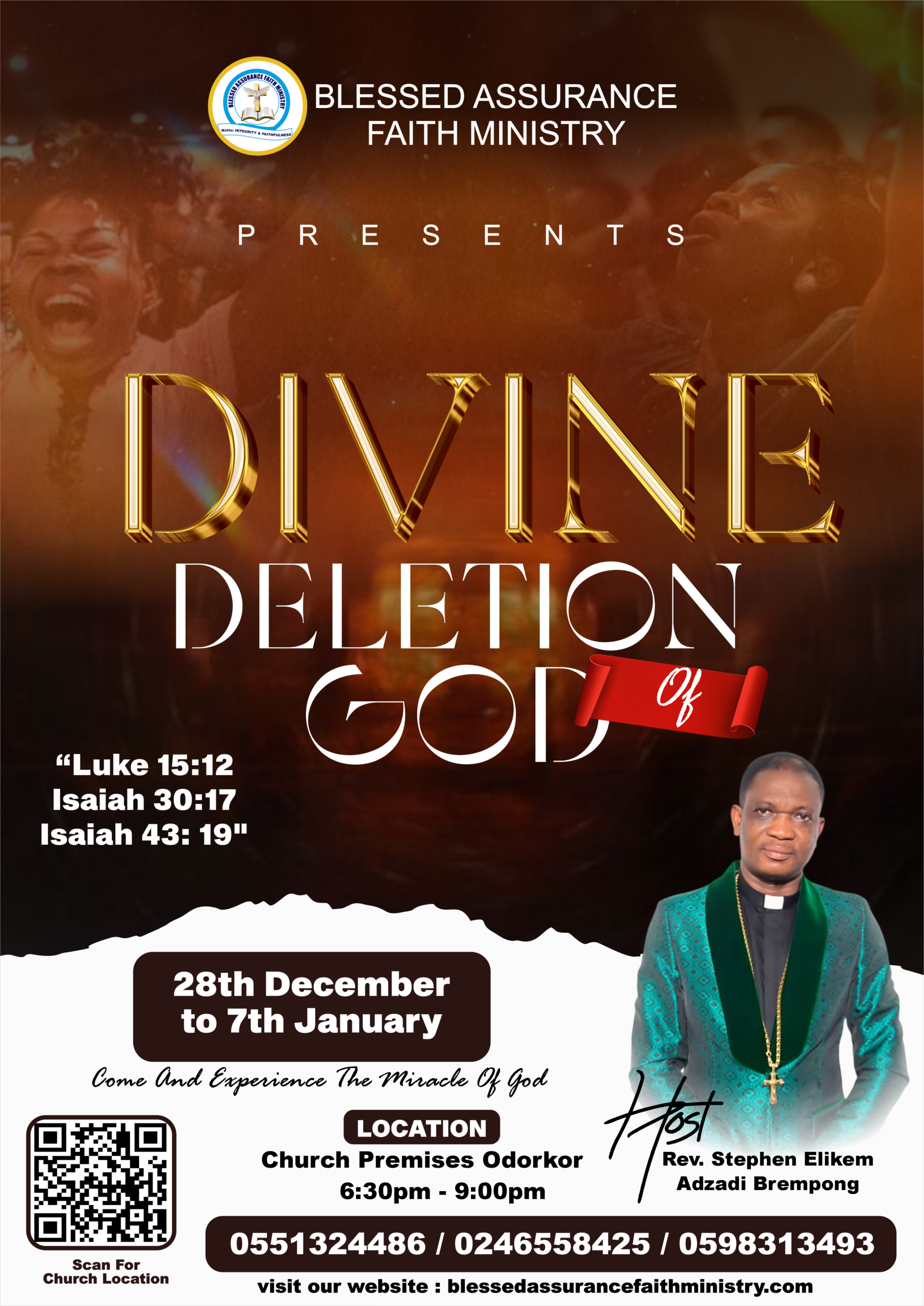 Divine Deletion of God is a prophetic and transformational program focused on God’s power to erase, remove, and wipe away everything that stands against His purpose in our lives. This program emphasizes repentance, fasting, prayer, and obedience as keys to experiencing divine restoration. In this season, God is not just correcting—He is deleting: Sin and guilt Generational patterns Spiritual limitations Delays and reproach Through sincere fasting and right living, we align ourselves with God’s will and make room for His mercy, healing, and breakthrough. Purpose of the Program To provoke genuine repentance and heart alignment with God To engage in biblical fasting that brings spiritual clarity To experience divine removal of burdens, yokes, and hindrances To restore joy, purpose, and divine direction Key Message When God deletes, He does not patch—He permanently removes.What fasting cannot delete, obedience will.What prayer begins, righteousness completes. Program Highlights Intensive prayer sessions Teaching on biblical fasting (Isaiah 58) Moments of repentance and surrender Prophetic declarations and worship Corporate prayer for freedom and restoration Expected Outcomes Renewed spiritual sensitivity Freedom from spiritual oppression Restoration of peace and joy Clear direction and divine help Closing Charge “This is the fast that I have chosen…” (Isaiah 58:6)As we seek God in truth and humility, may He divinely delete every record, burden, and limitation that is not of Him—so His glory may be revealed in our lives.